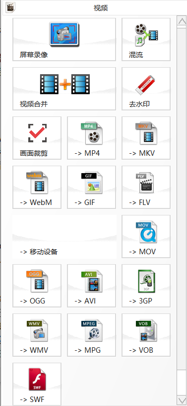 可以转换到各种常用格式:MP4, MKV, WebM, GIF, FLV, MOV, OGG, AVI, 3GP, WMV, MPG, VOB, SWF
