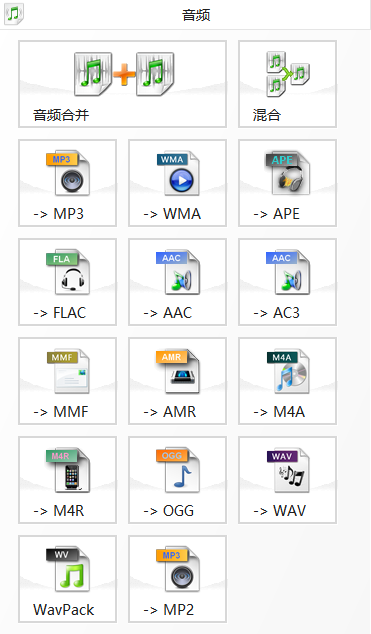 支持转换到各种常用格式:MP3, WMA, APE, FLAC, AAC, AC3, MMF, AMR, M4A, M4R, OGG, WAV, WavPack, MP2