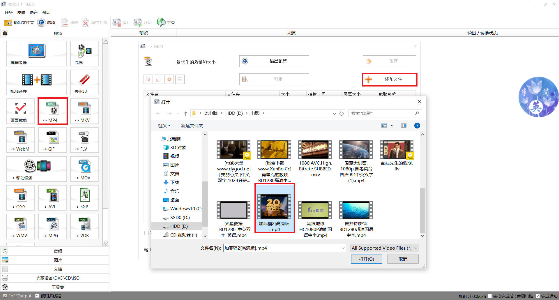 选择转换到的格式,如我要转换到mp4,就点击mp4,再添加文件,选择要转换的文件