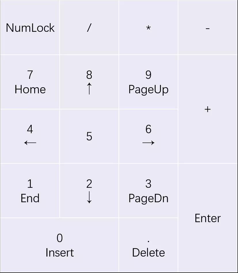 全称NumberLock,中文名数字键盘锁定键。锁定时指示灯亮。仅针对小键盘区,锁定时(上)和不锁定时(下)的按键如下图所示。